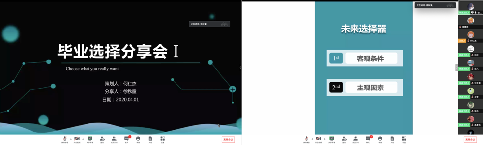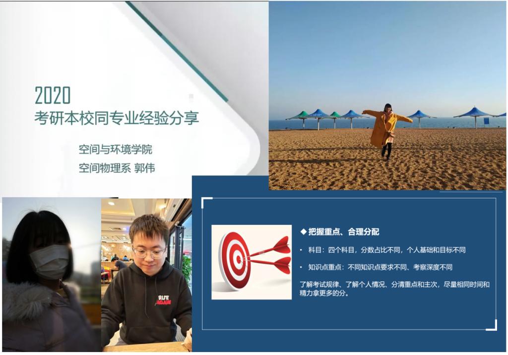 为做好疫情当下学生成长成才教育,空间与环境学院近期组织了四场本科生毕业规划经验分享会,依托朋辈帮扶,传授保研、考研、就业、出国等经验,引导学生合理规划未来。由16级本科生何仁杰组织并主持,多名16级本科生、研究生及已就业毕业生主讲。四场分享会主题分别为:如何做出选择、保研经验分享、考研经验分享和留学就业经验分享。