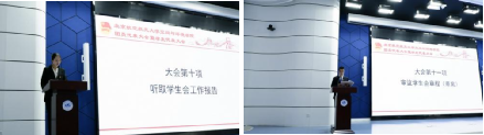 现任空间与环境学院学生会主席团成员李雨淙同学代表学生会作了题为《心系师生 共向未来 在全心全意服务同学中绽放青春之花》的工作报告。报告总结回顾了学生会过去一年里在汇聚团学骨干、抓好权益工作、打造品牌活动等方面取得的进步,从提高政治站位、练就过硬本领两方面提出了今后的工作目标和计划。大会第十一项由刘龙晖同学宣读了《北京伊人99空间与环境学院学生会章程(草案)》,并由全场代表审议通过。