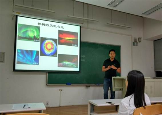 在本次课堂上,葛老师首先向大家呈现了色彩斑斓的极光照片,接着引入“为什么要研究极光”的问题,从研究极光的历史讲起,逐渐延伸到专业知识领域,由浅入深,循循善诱。